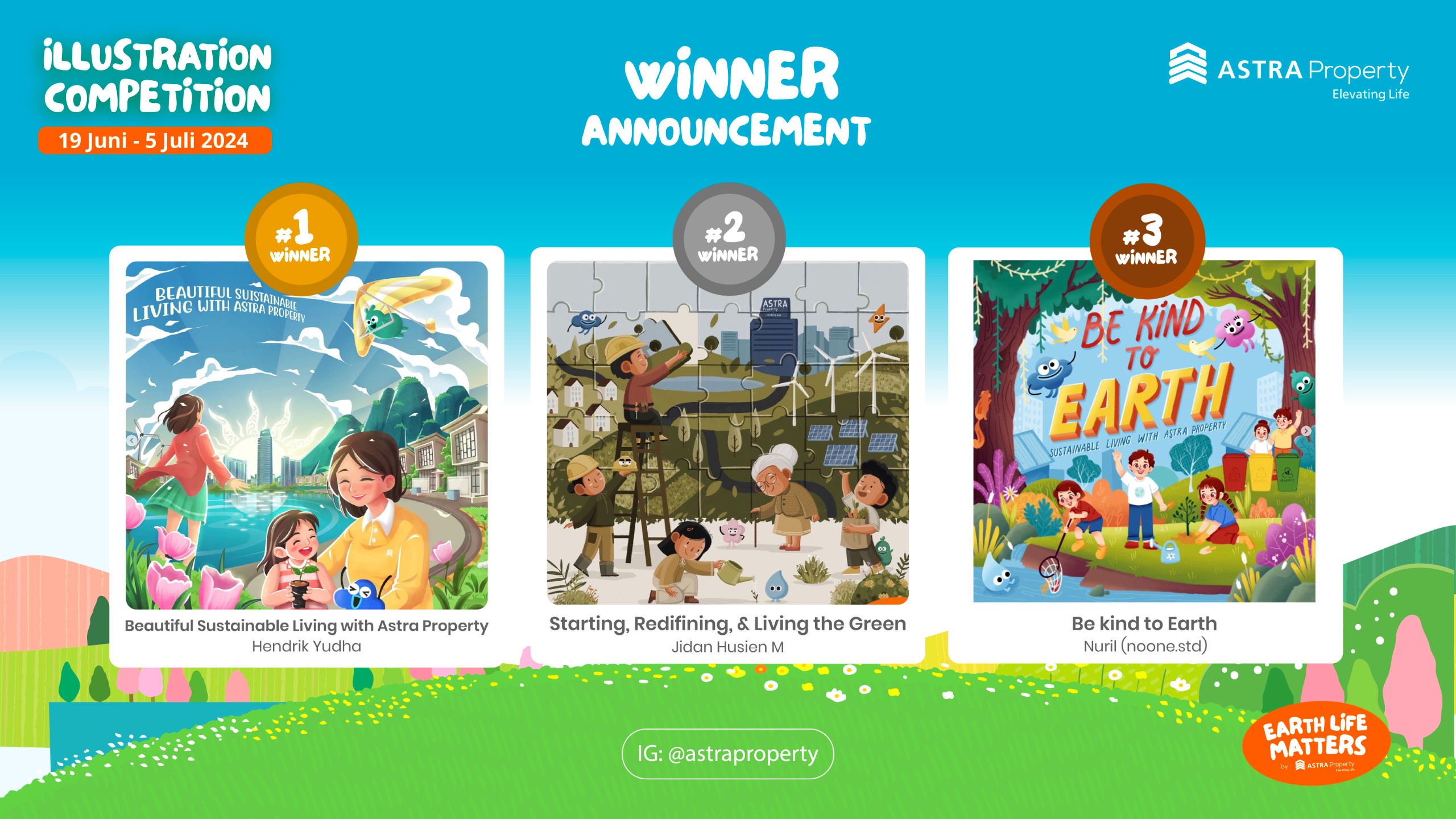 Selamat kepada para pemenang dan terima kasih kami ucapkan kepada seluruh peserta yang telah berpartisipasi untuk menyumbangkan ide dan menuangkan kreativitasnya untuk kompetisi ilustrasi bertema sustainability kali ini. Jangan patah semangat karena Astra Property masih memiliki program-program menarik lainnya untuk diikuti!